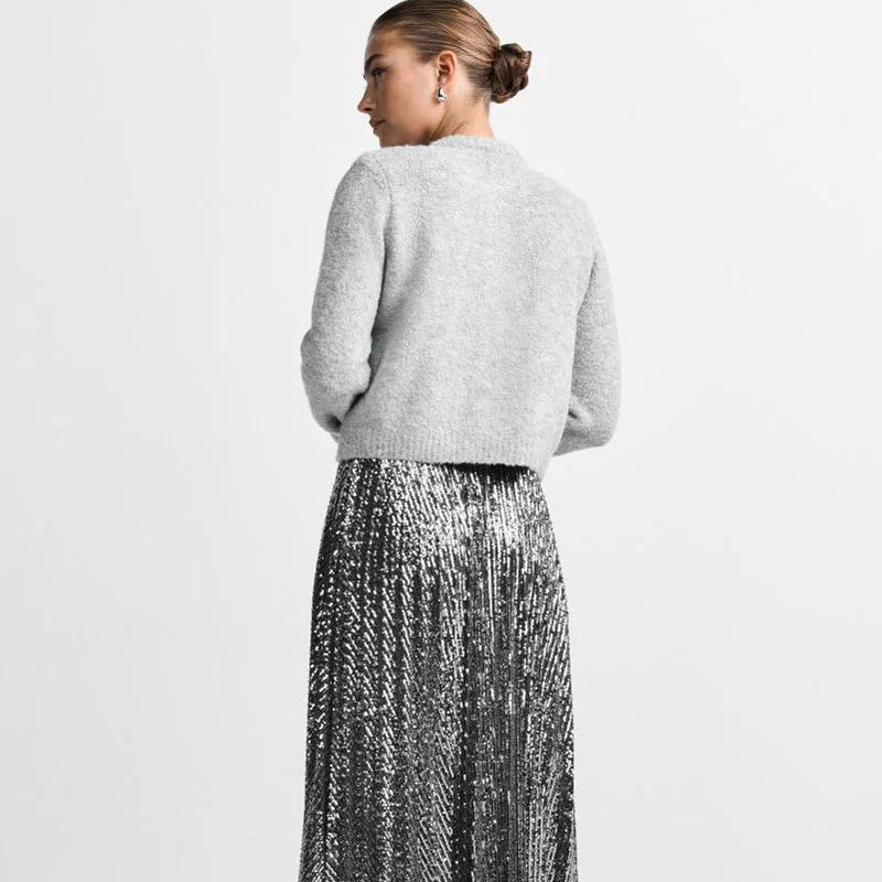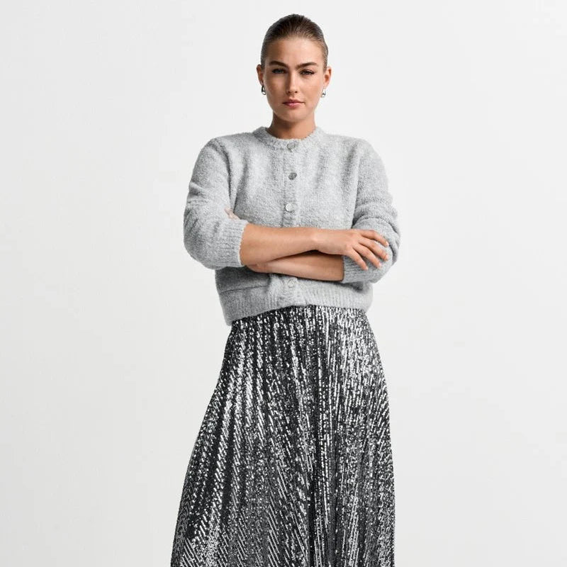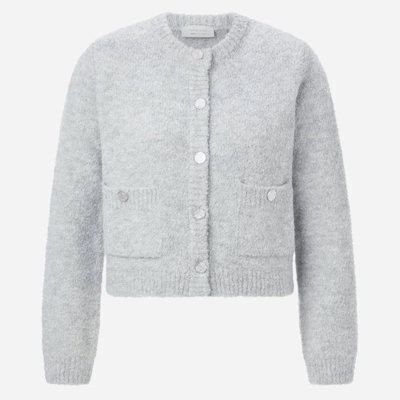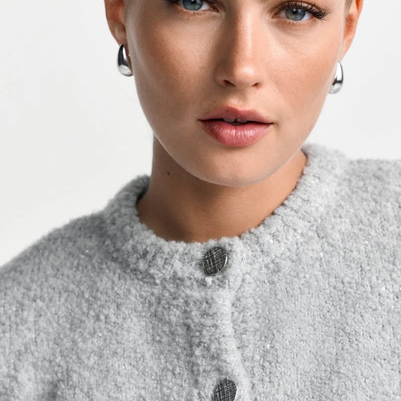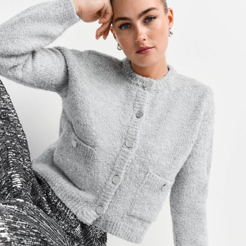 This light gray bouclé cardigan, with its soft, fluffy wool blend and silver-tone buttons, adds an elegant touch to your winter looks. The cropped fit and patch pockets give it a modern chic.