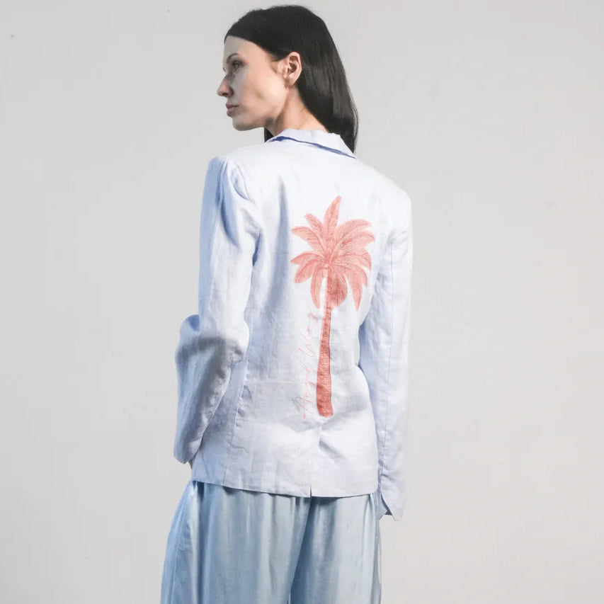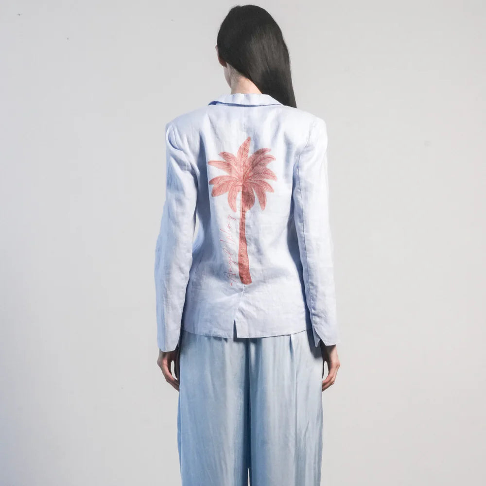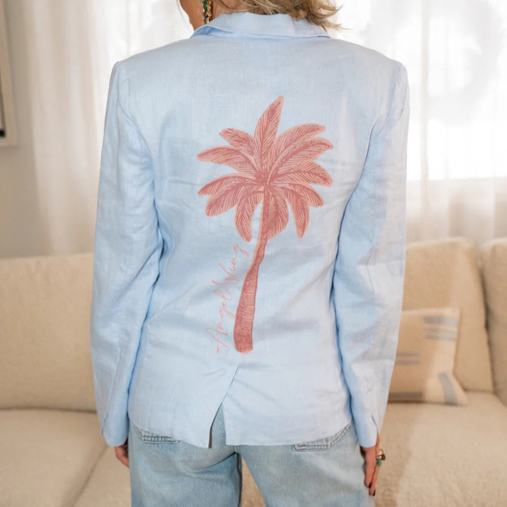 Decidedly tailored and one of our top selling silhouettes, this single-breasted blazer features pal tree detailing on the back.