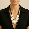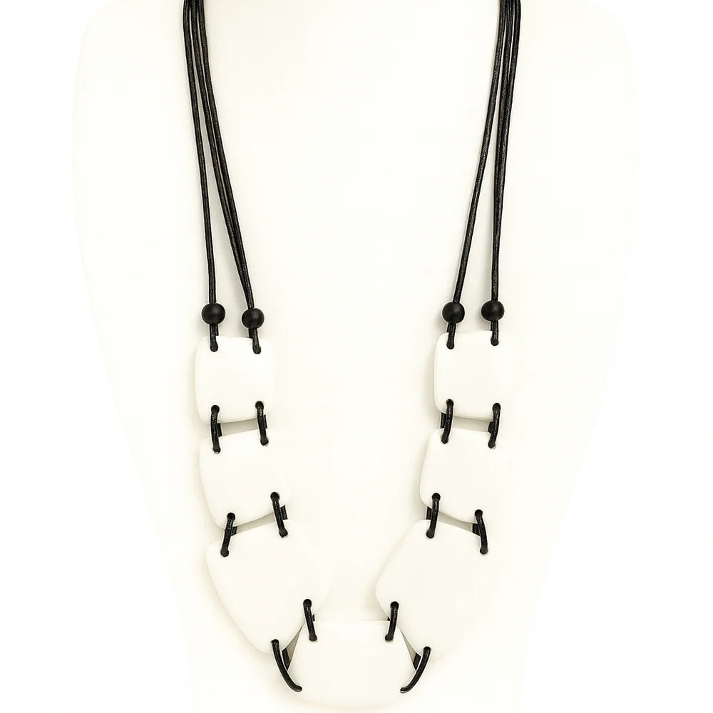 Elevate your outfit with this bold white resin statement necklace. Featuring five glossy, geometric resin pieces strung on a sleek black cord, this piece blends modern minimalism with a contemporary edge. Lightweight yet eye-catching, it’s perfect for casual wear, work outfits, or special events.