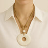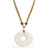 Make a bold fashion statement with this modern white resin pendant necklace from Bel-Eve Jewellery. Featuring a smooth, donut-style resin pendant on an elegant multi-strand gold-tone cord, this piece combines minimalist style with a touch of boho-chic flair. Perfect for women’s fashion, it adds a unique edge to both casual and dressy outfits.