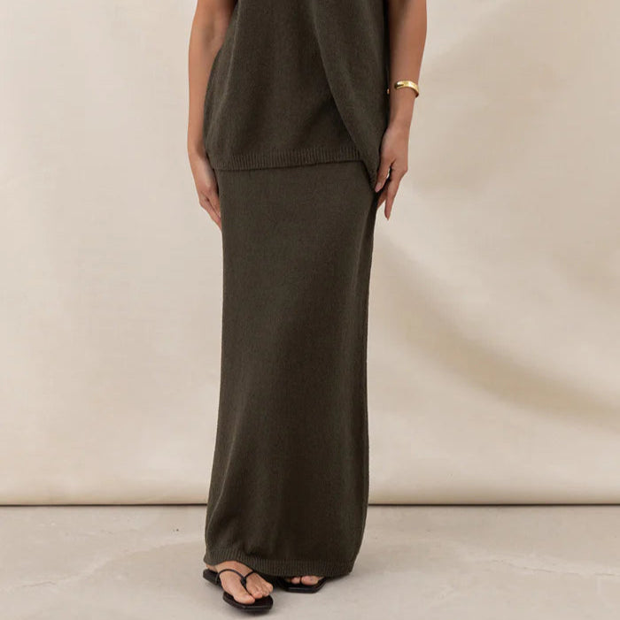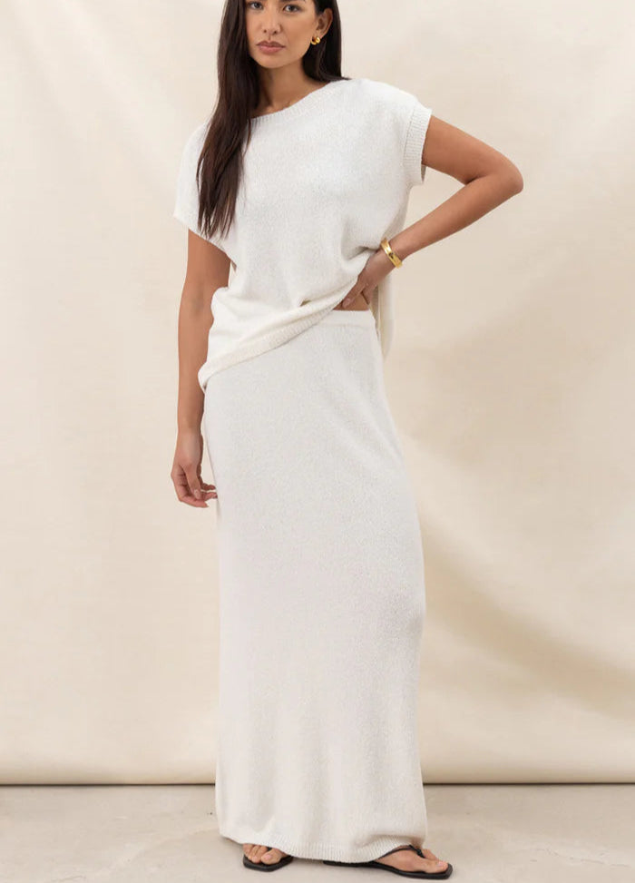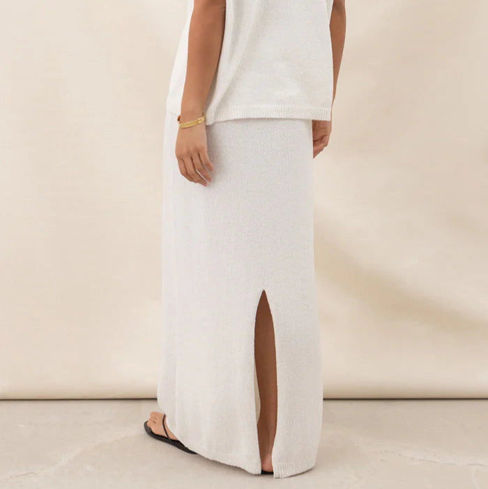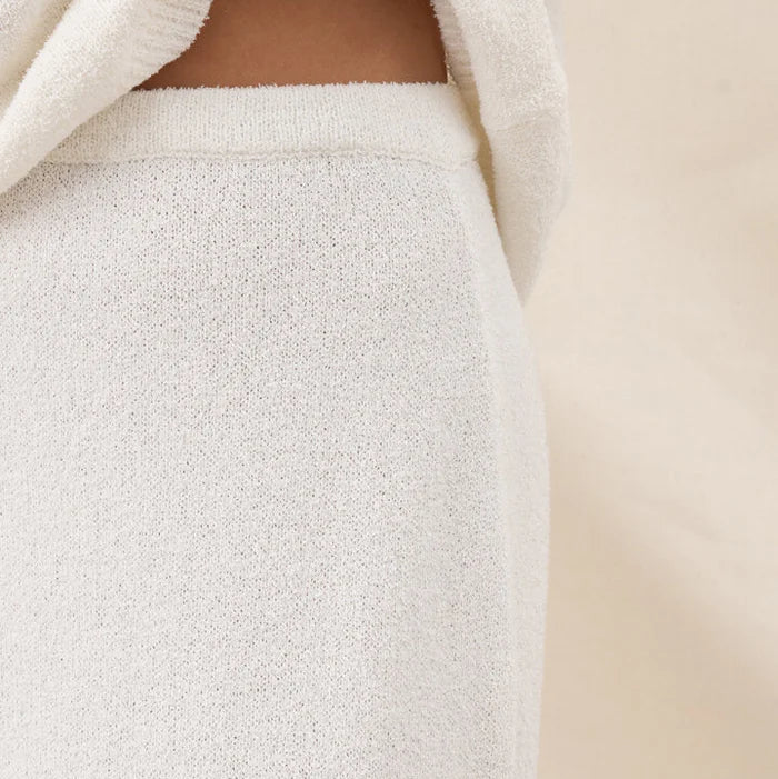 The textured cotton bouclé knit offers a touch of subtle sophistication, while the elasticated waistband ensures a perfect, all-day fit. Designed with a practical back split for ease of movement, this skirt combines style and comfort beautifully.