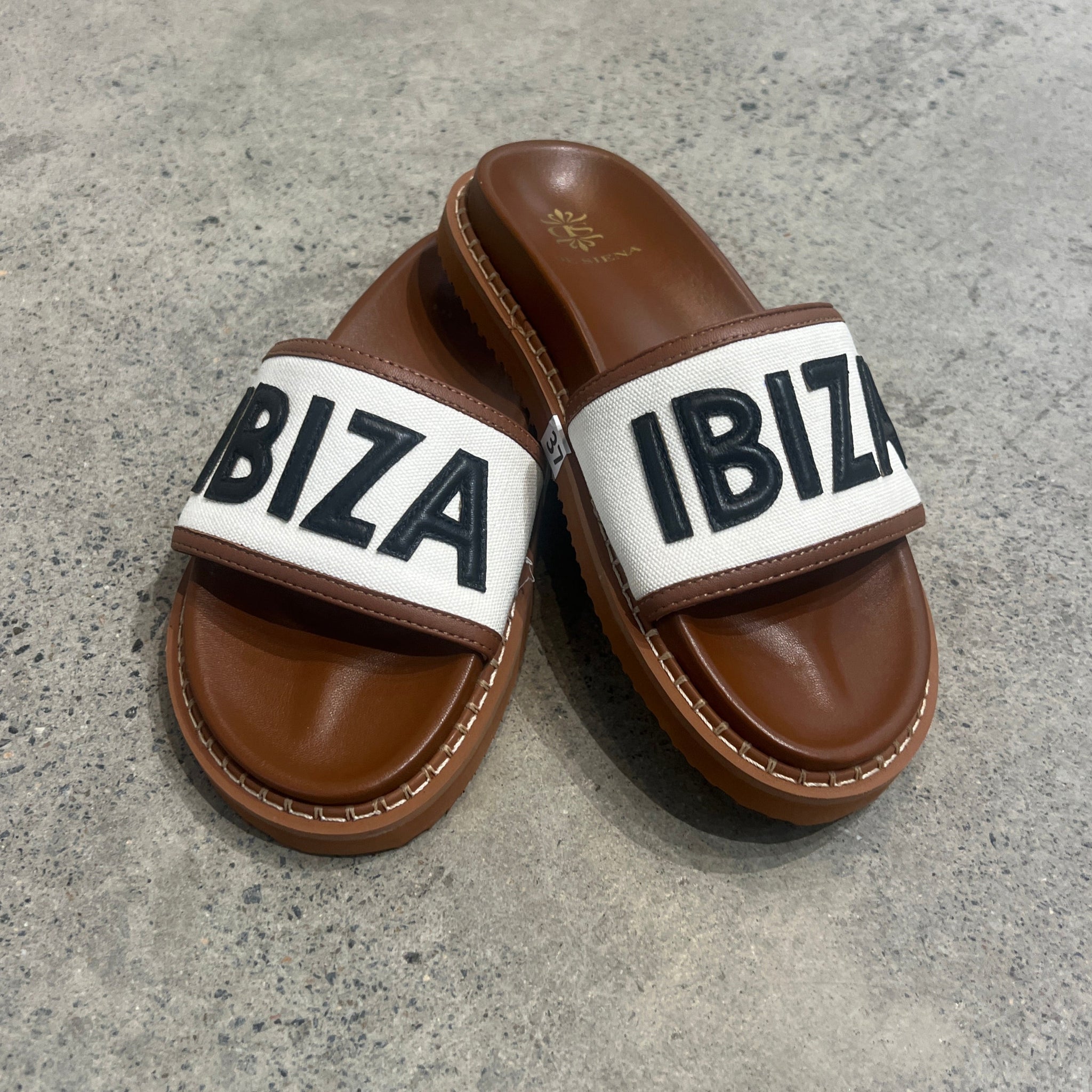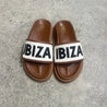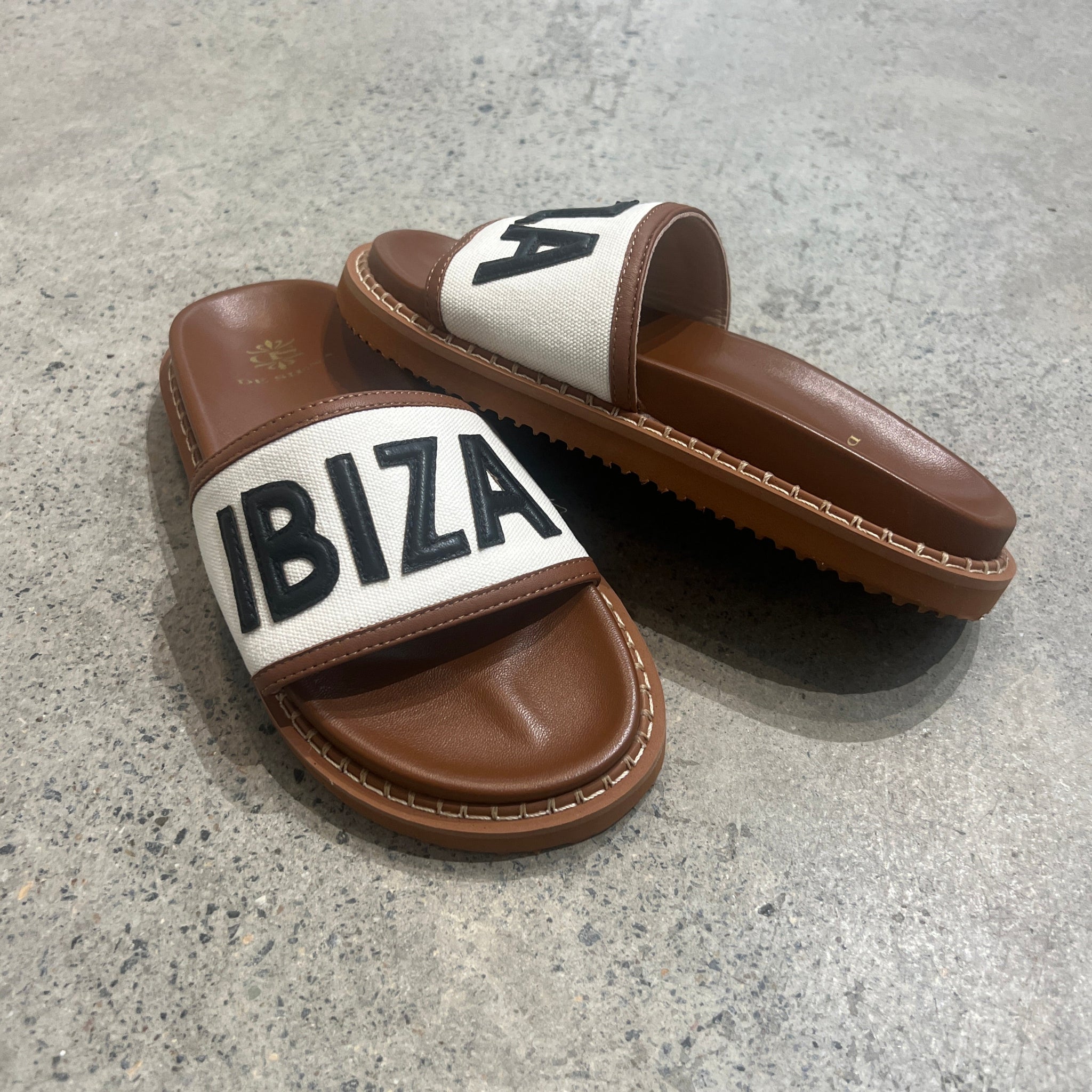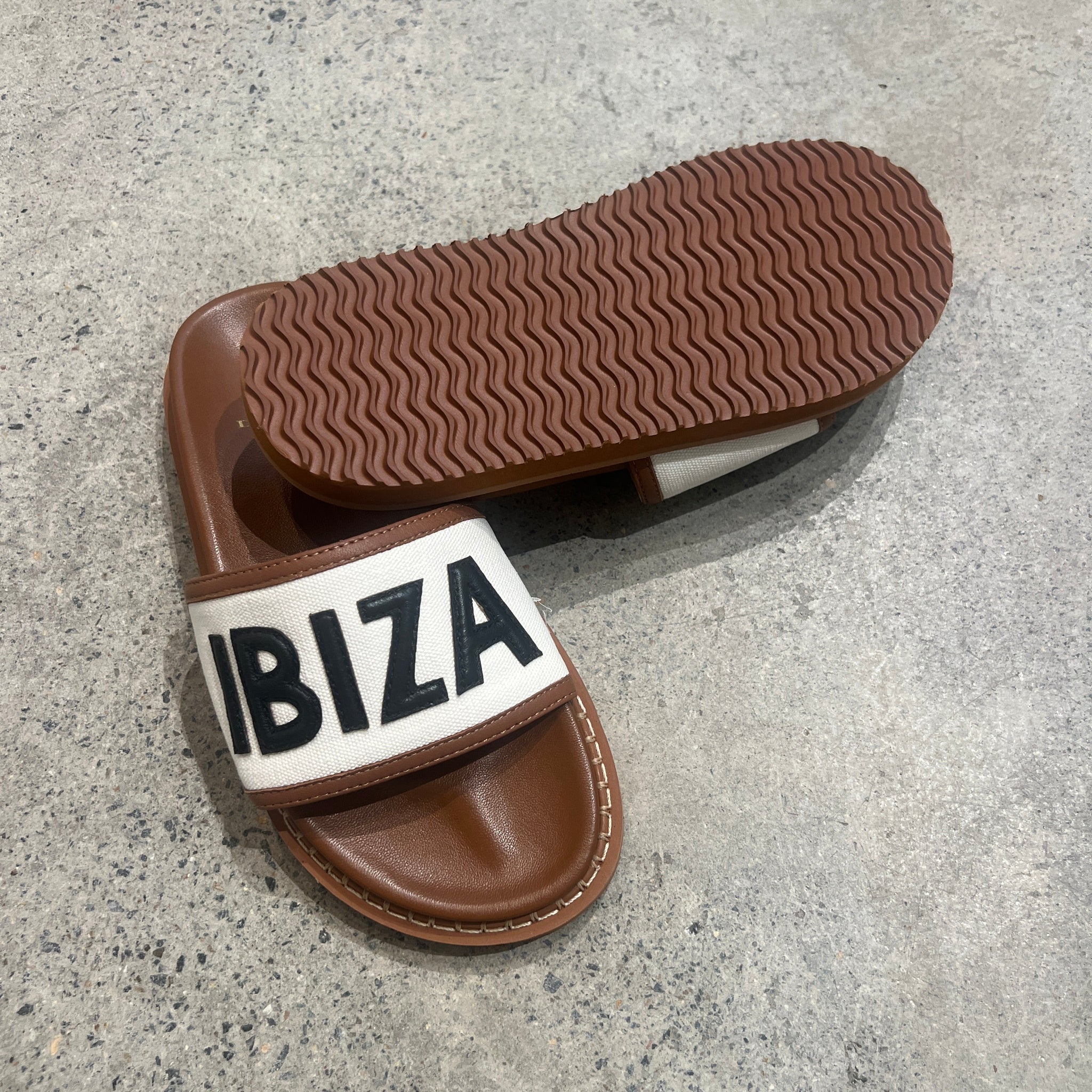 Welcome to Ibiza. You'll catch us wearing these fussbett slides during our vacation in Ibiza, heading to the beach or for a stroll through town. Hand crafted with canvas and letters in leather, these very comfy flats in black and white are the best companions for a fun day.