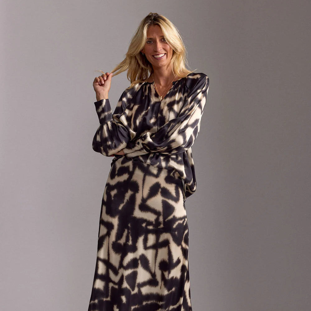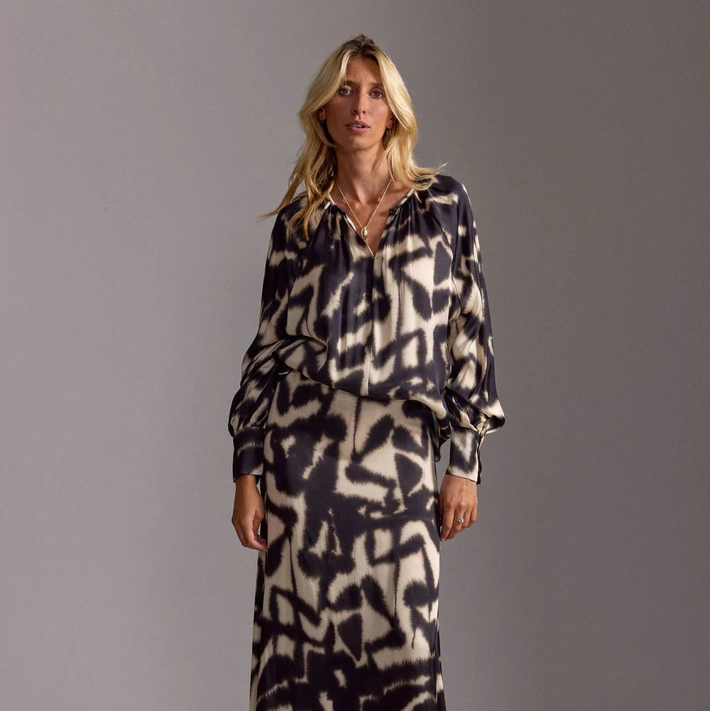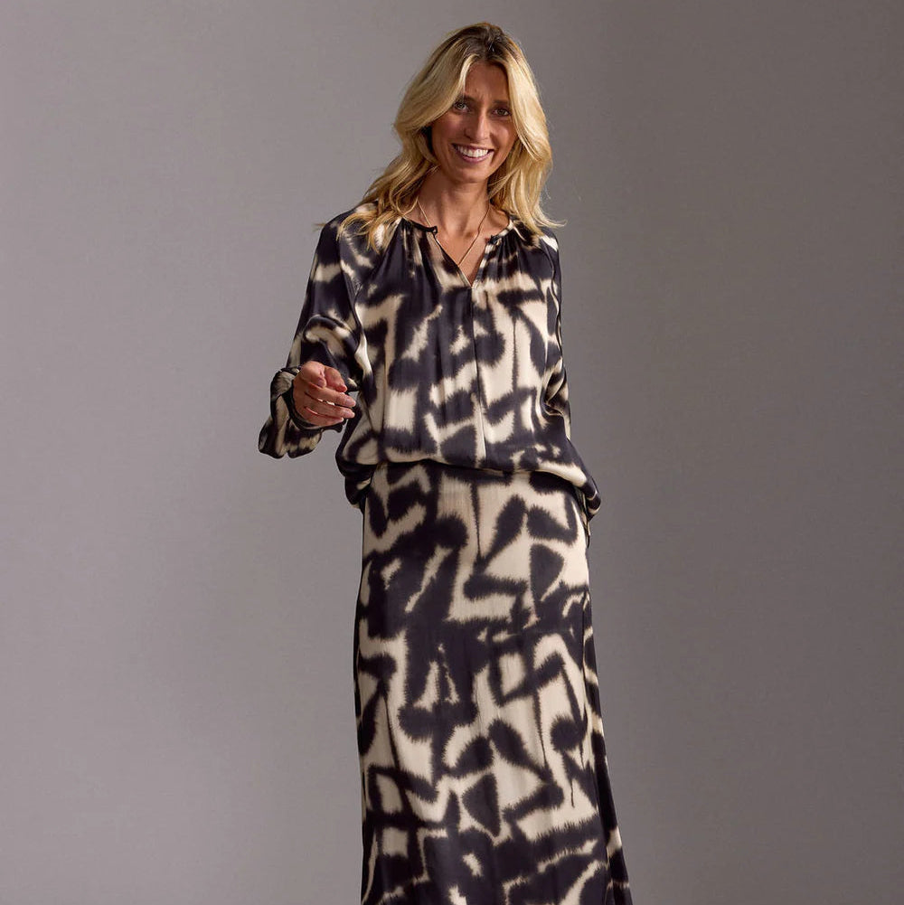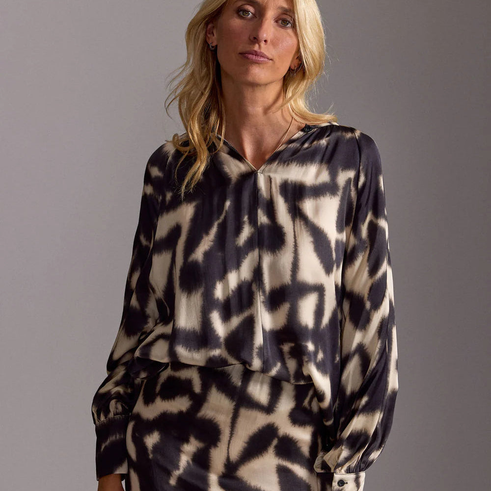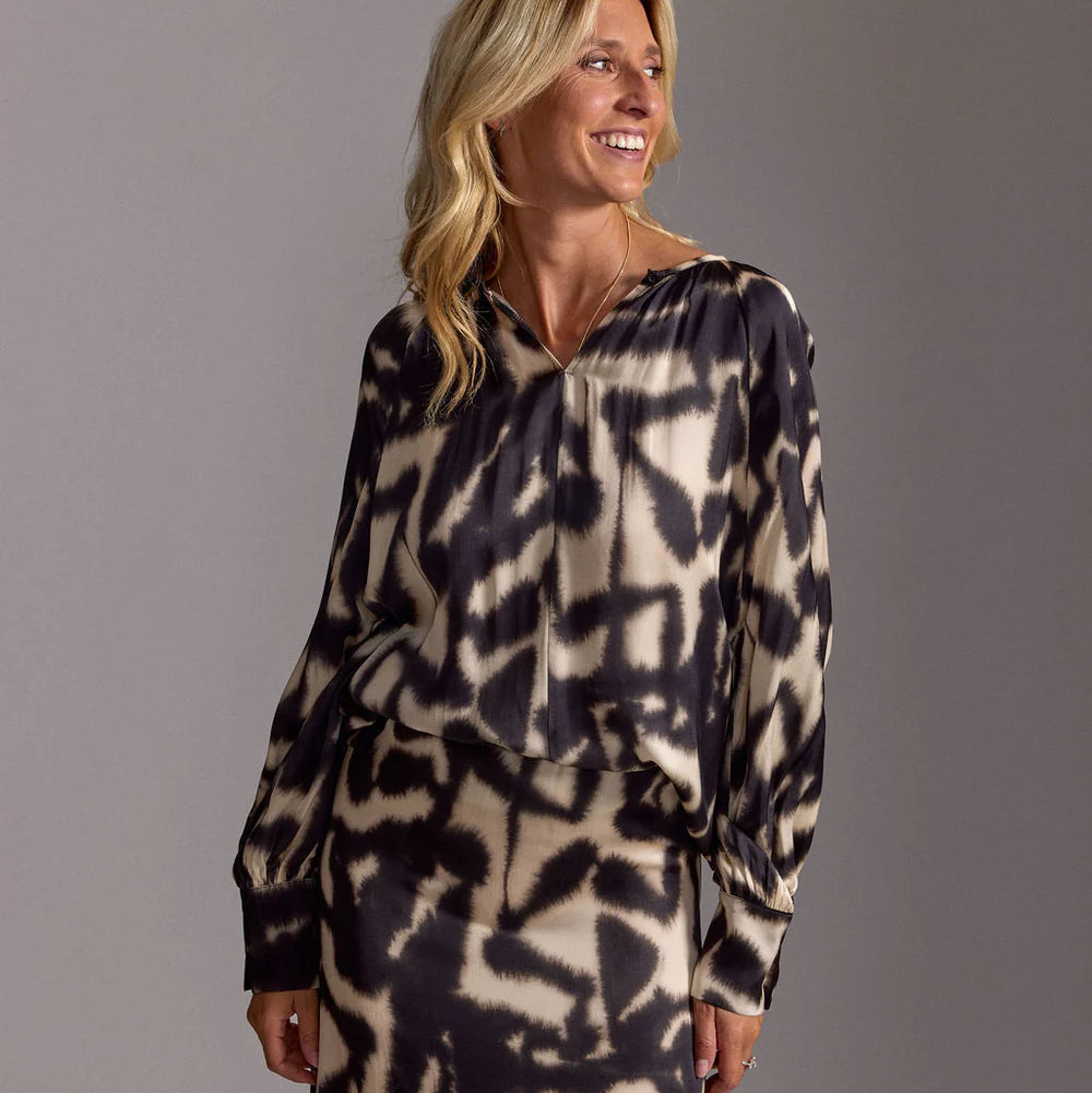 Telma Beige Printed Shirt - Round Neck & Elasticated Raglan Sleeves.