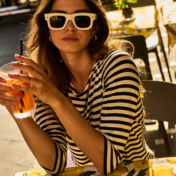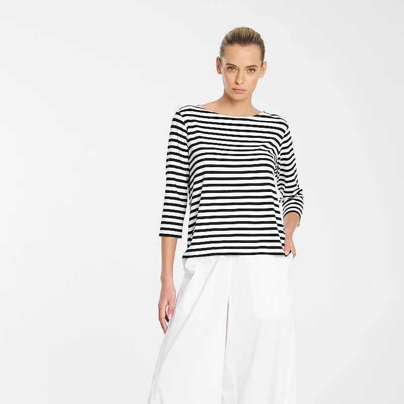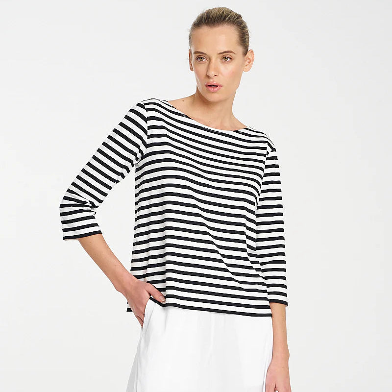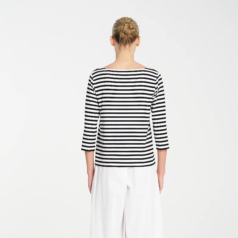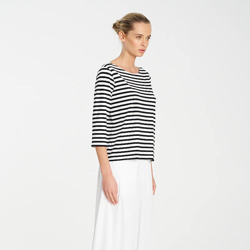 A core Mela Purdie silhouette. The Relaxed Boat Neck is versatile and has a flattering boat neckline and 3/4 length sleeve. Crafted in the Picasso Stripe Jersey, this classic stripe is the perfect staple for your wardrobe.