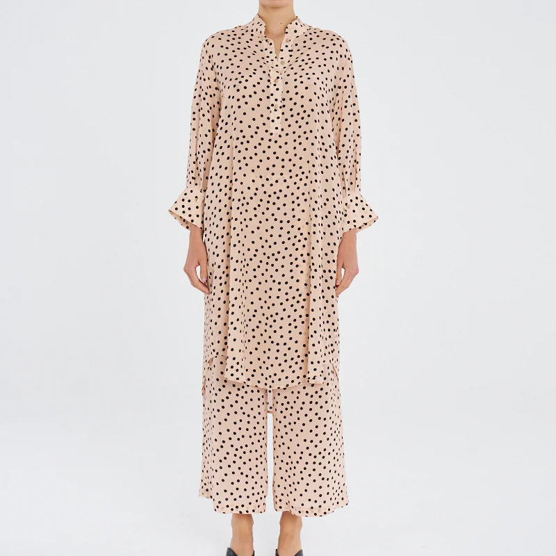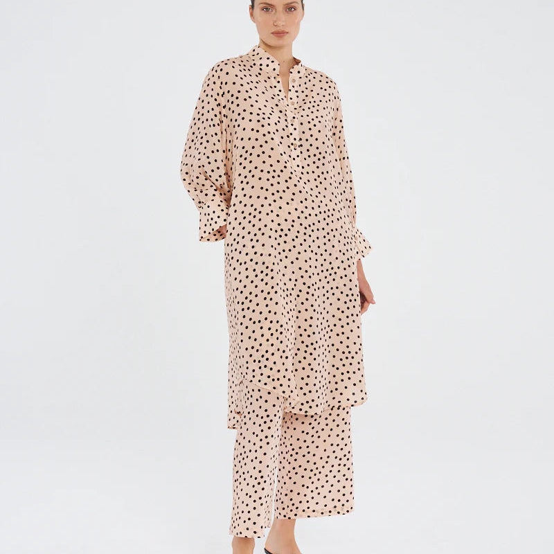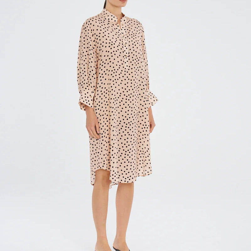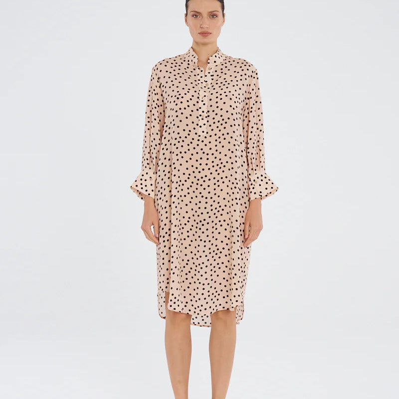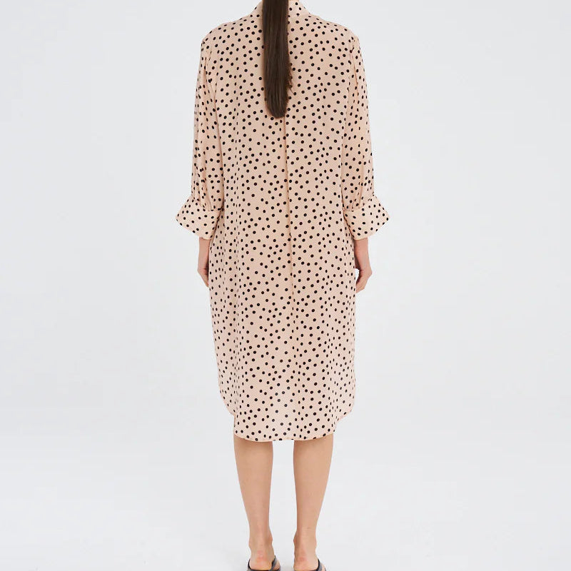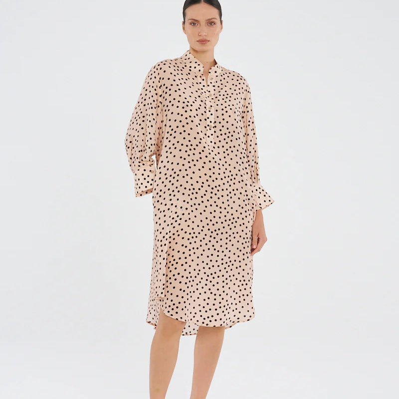 Crafted in Mela Purdie's mid-weight, soft washed Silk Crepe De Chine, in the effortless Scattered Spot Print, an easy to wear print, perfect for all occasions. The Resort Dress features a stand collar and gathered 3/4 length sleeve. An effortless silhouette that can be styles for any occasion.