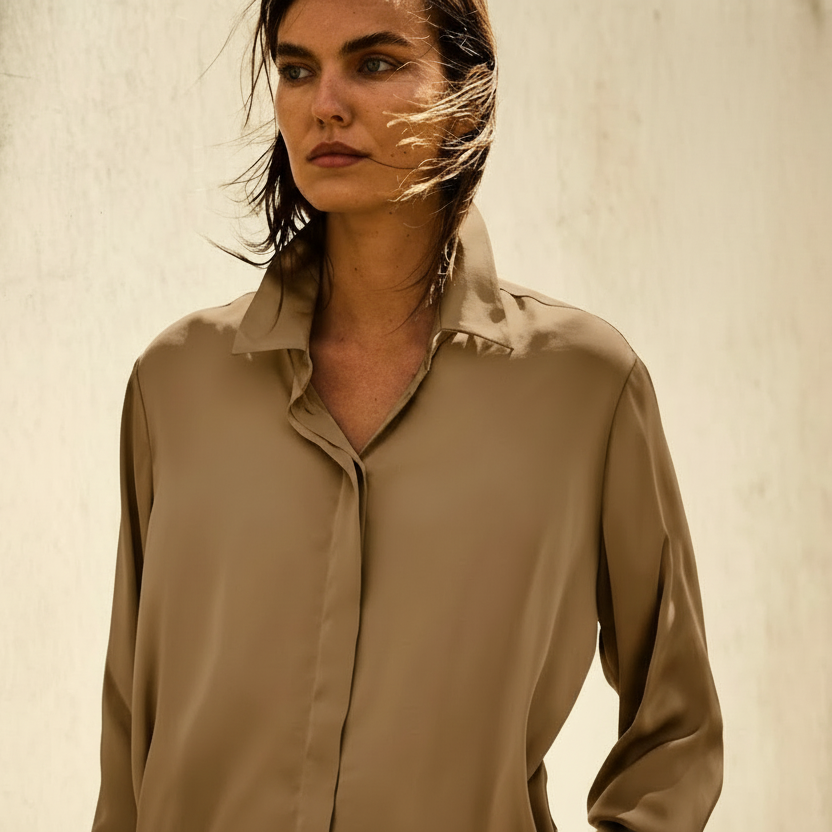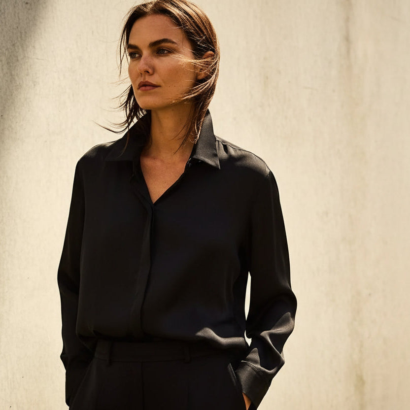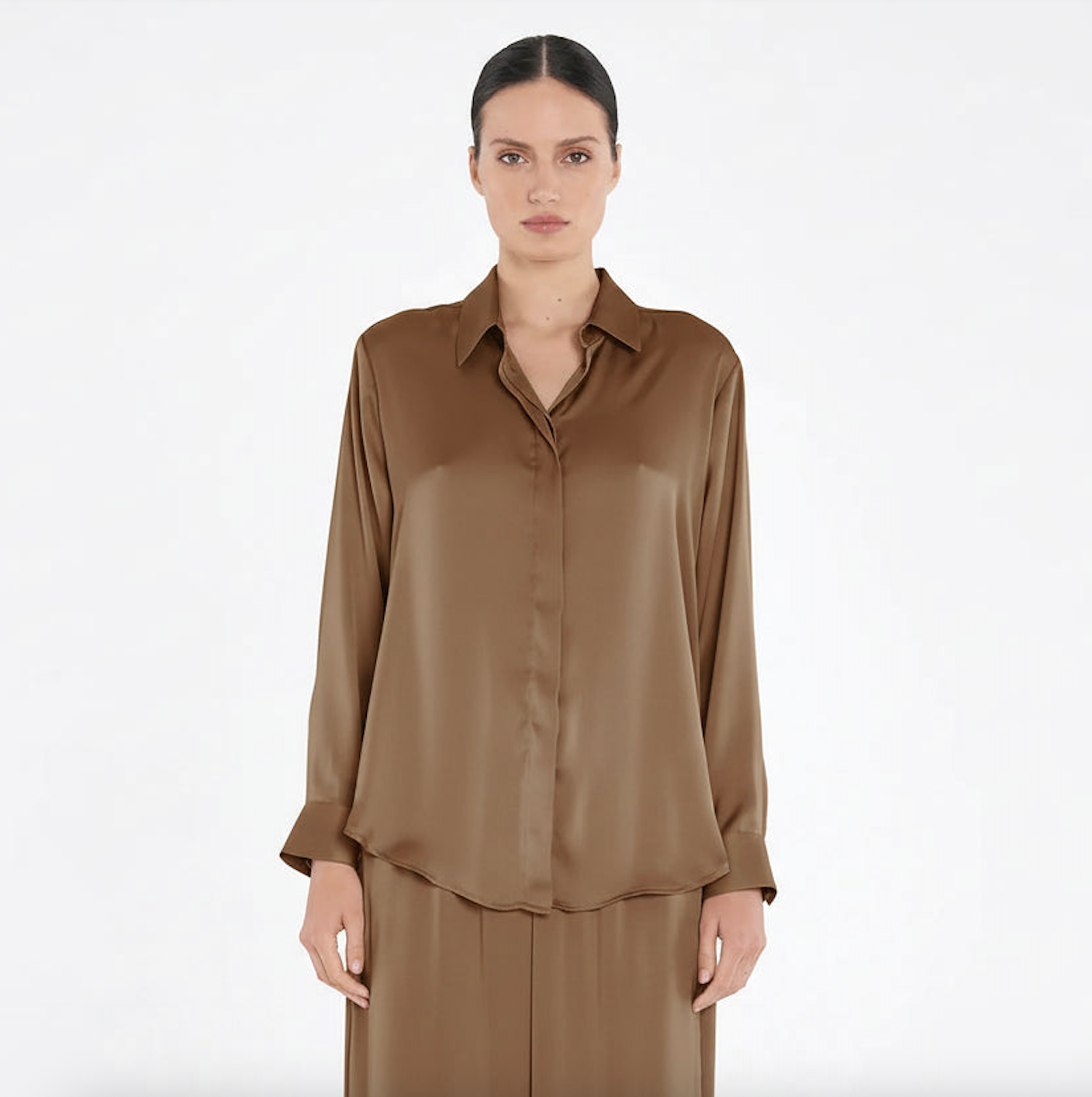 Crafted from Mirror Satin a fine gauge featherlight satin with an air flow finish for easy wearing. Mela Purdie's timeless Soft Shirt featuring a relaxed fit and classic shirt detailing it is an easy go to silhouette for day to night.