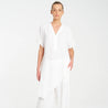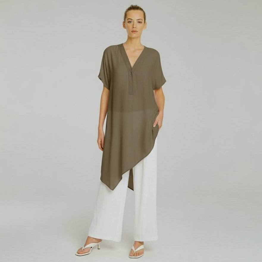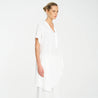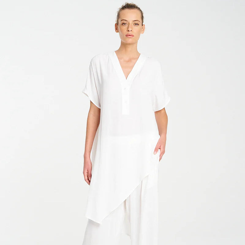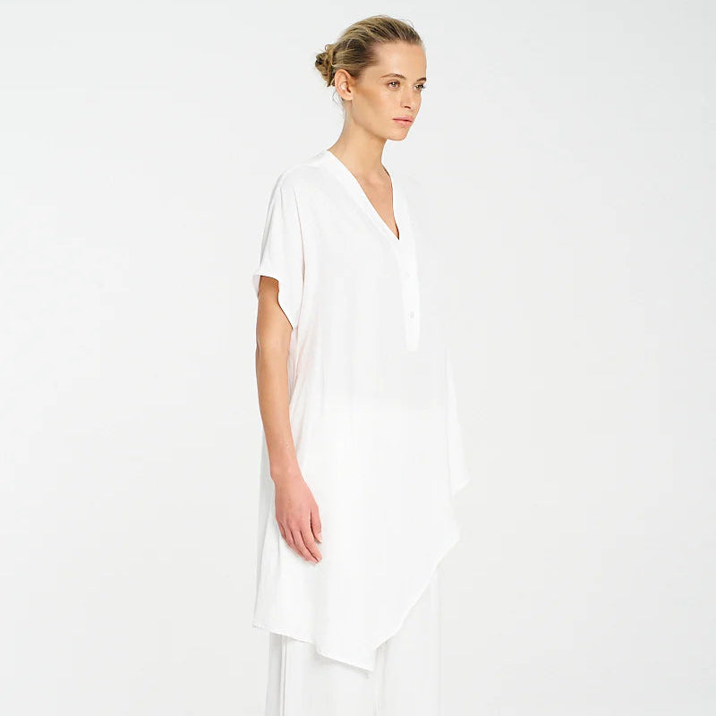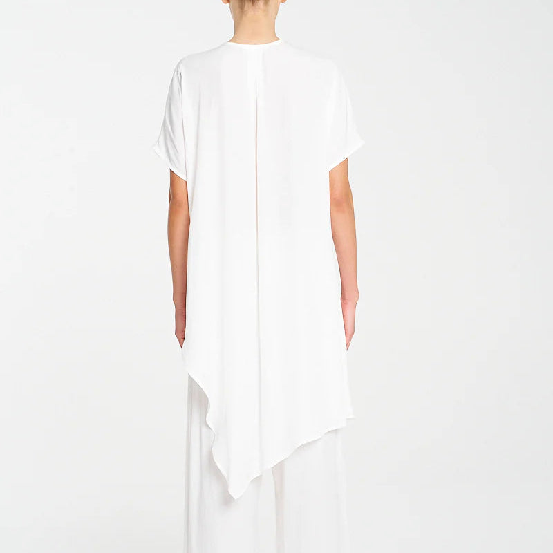 Crafted from Mela Purdie's classic Mache, a fine Denier technical weave with an airflow finish. The Veil Tab Shell features a long asymmetrical hemline and a flattering v neckline with a button closure.