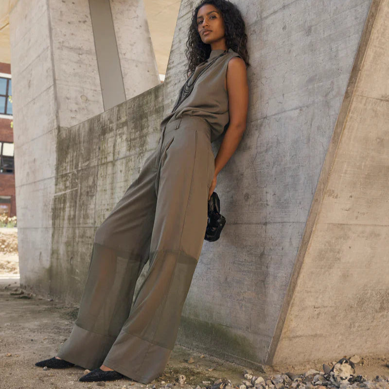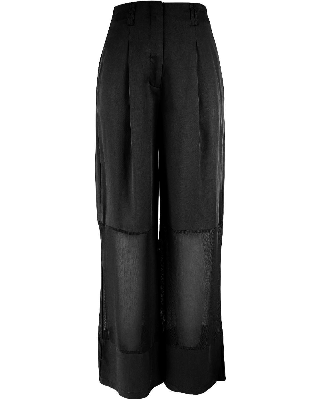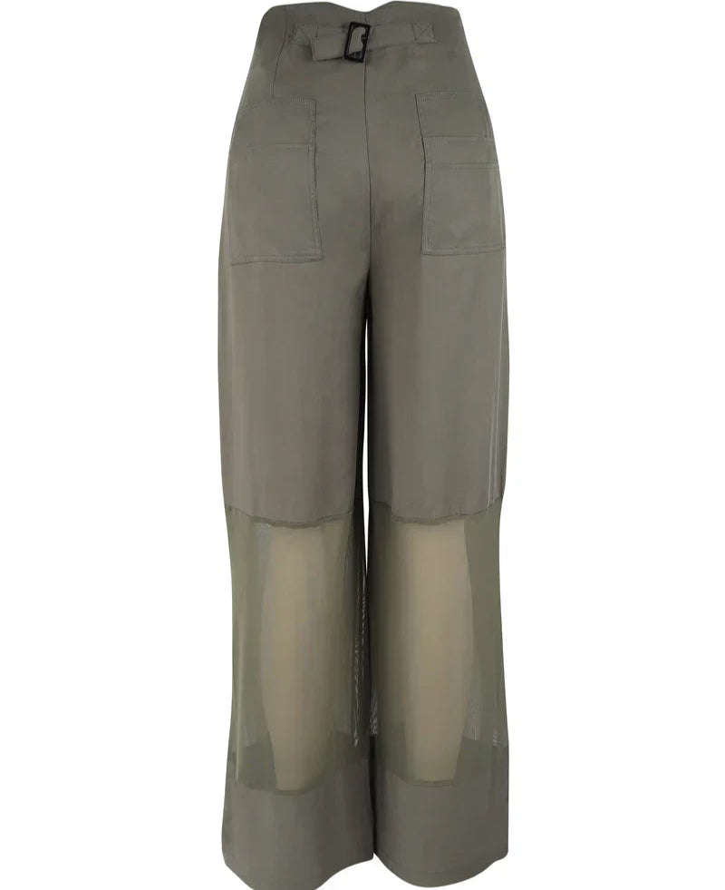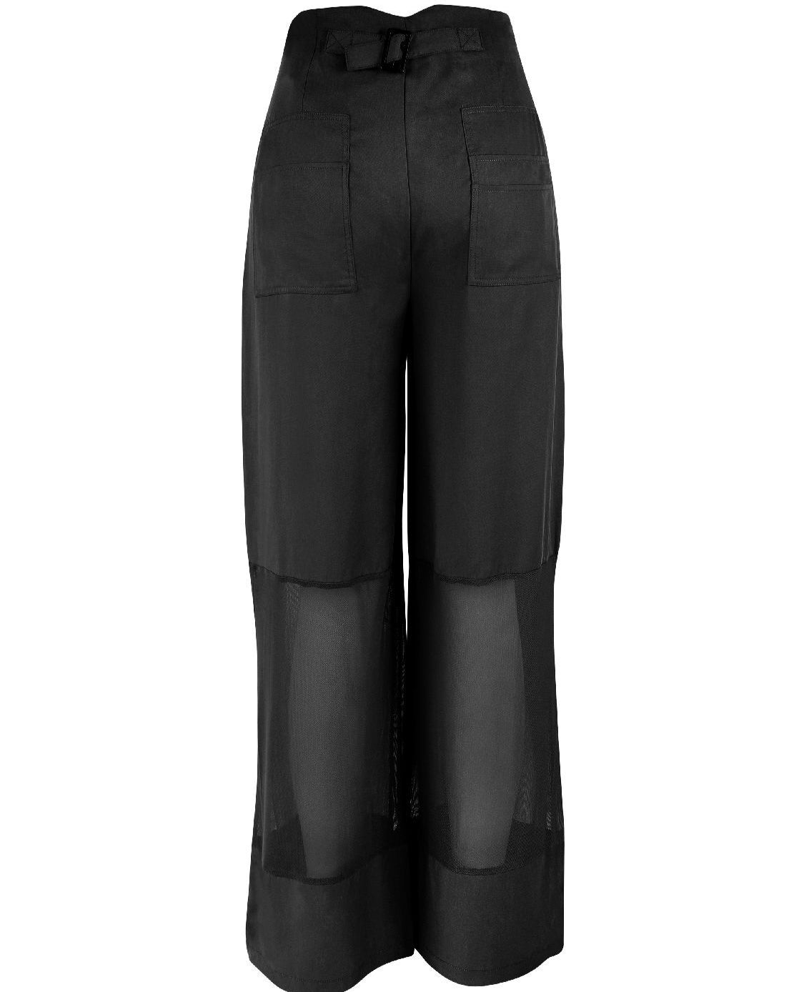 These unique trousers create a modern and bold look with their transparent mesh details below the knees, which playfully balance between lightness and elegance. The design features two back pockets with flap details and an adjustable buckle at the back, adding a raw edge. The wide legs form an elegant silhouette, perfect for both casual and sophisticated outfits.