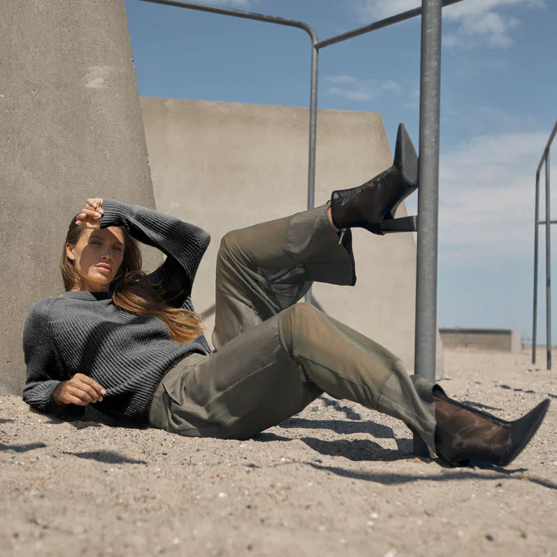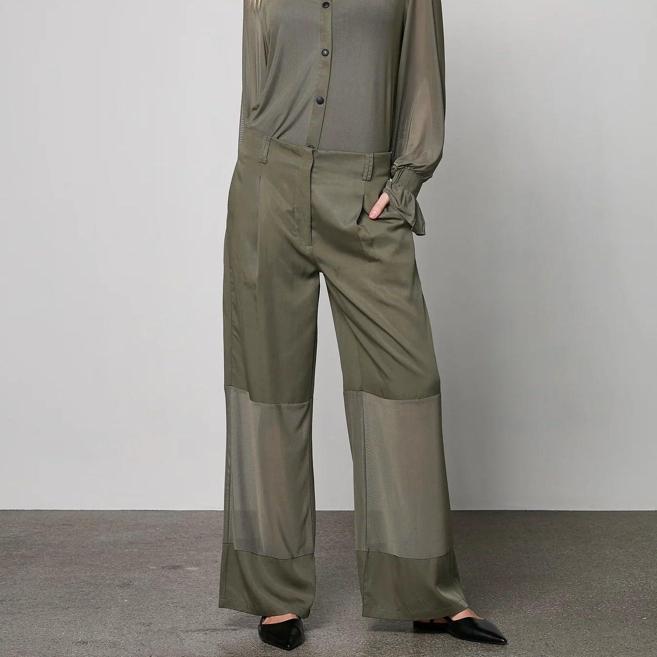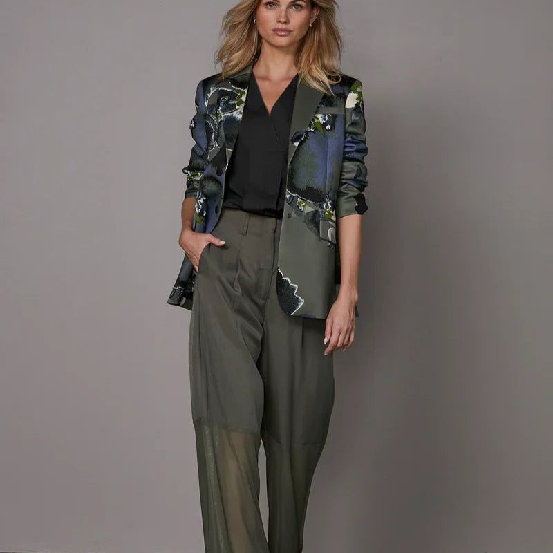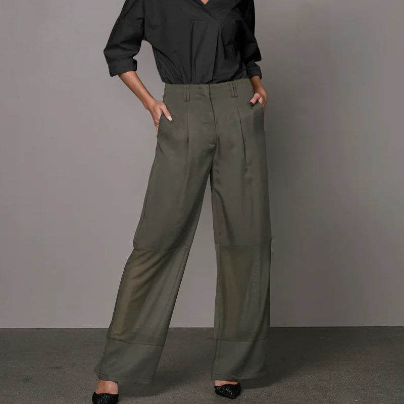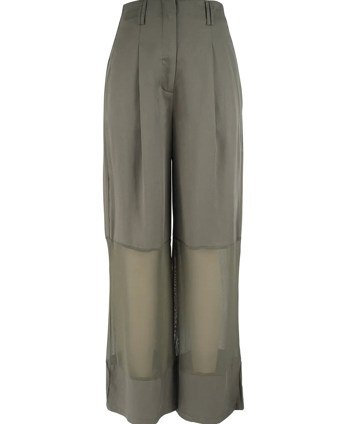 These unique trousers create a modern and bold look with their transparent mesh details below the knees, which playfully balance between lightness and elegance. The design features two back pockets with flap details and an adjustable buckle at the back, adding a raw edge. The wide legs form an elegant silhouette, perfect for both casual and sophisticated outfits.